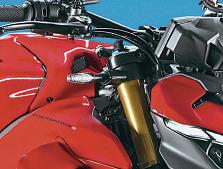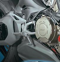the Streetfghter doesneed to have moreofa comfort element to it than the Panigale,the rear linkage is moreprogressivethan the Panigale’sfor asofter initial part ofthe stroke and thefront forkshave an extra5mm of travel, along with slightly lazier steering geometrythan the Panigale,which is whythe Streetfghter hasan11mm longer wheelbase.