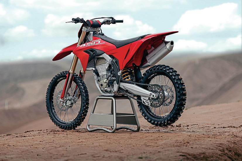 Ducati says it’sgiven theDesmo450 MX aunique electronics package with an IMU-assisted traction controlset-up,easily bypassed by dipping theclutch when you want to freely spin it up,and two power modes.There’salso adjustable engine brakecontrol, launch controland an up-only quickshifter as stock. Brembo brakes,Galfer discs,Pirelli ScorpionMX32 tyres,Takasago Excel wheels anda DID chain rounds off thespeclist, and it weighs104.8kgwet without fuel in the 7.2-litre tank.Priced at £11,245, the Desmo450 MX is on sale now.