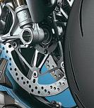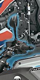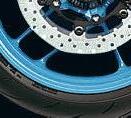 Bolted to the front carbonhoop is apair of ginormous BremboT-Drivefinned discs, 338.5mm wideand 6.2mm thick, whichare just aboutthe biggest youcan practically fit ontoa 17in rim. These monster discs are clamped by Brembo’sposhest newroad calipers,the GP4 Sport Productionbillet monobloc designs,with titanium-finish nickel plating, cooling finsand sweet carbon air cooling ducts.Add an MCS 19.21 master cylinder with remote adjuster and you have asuperbike-spec stoppingpackage that’salso road-homologated.