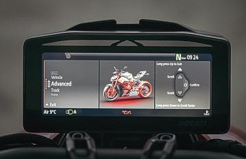 And so to the electronics. The phrase ‘dripping in tech’ hasneverbeen more appropriate given that the Streetfghter has literally every single adjustable toyinthe box as part of its menu, so we’retalking about ABS including asnazzy race system that applies the rear brakefor youoncorner entry, traction control, slide control, engine brakeand wheelie control, none of which really need any explanation. However,the introduction of a newtype of system, the likes of which has neverbeen seen beforeonaproduction bike, makes its debut, known as Ducati Vehicle Observer(DVO).Ittook me awhiletoget my head round howitworksand what it does, partially because it’ssocomplexthat inevitably Ineeded more information to understand it, which is when Iran into the secondproblem Ducati is quite secretiveonthe nitty gritty about howitworksbecause it’sdeveloped entirely by Ducati Corse as part of its MotoGP programme–development that is stillongoing. But here’smyunderstanding…