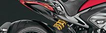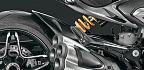 As on the it’s mated to a new monocoque aluminium main frame unit, rather than the old-school steel tube trellis frames seen on the Diavels. The rest of the chassis is also similar: 50mm upside-down Marzocchi front forks and a remote reservoir rear monoshock, both adjustable, and a slick single-sided rear to show off the new rear wheel. Ducati has also the belt drive us earlier XDiavels favour of a normal