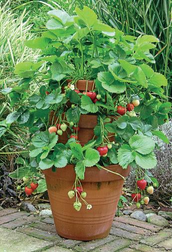 Asimple strawberry tower made from various sized pots stacked on top of each other