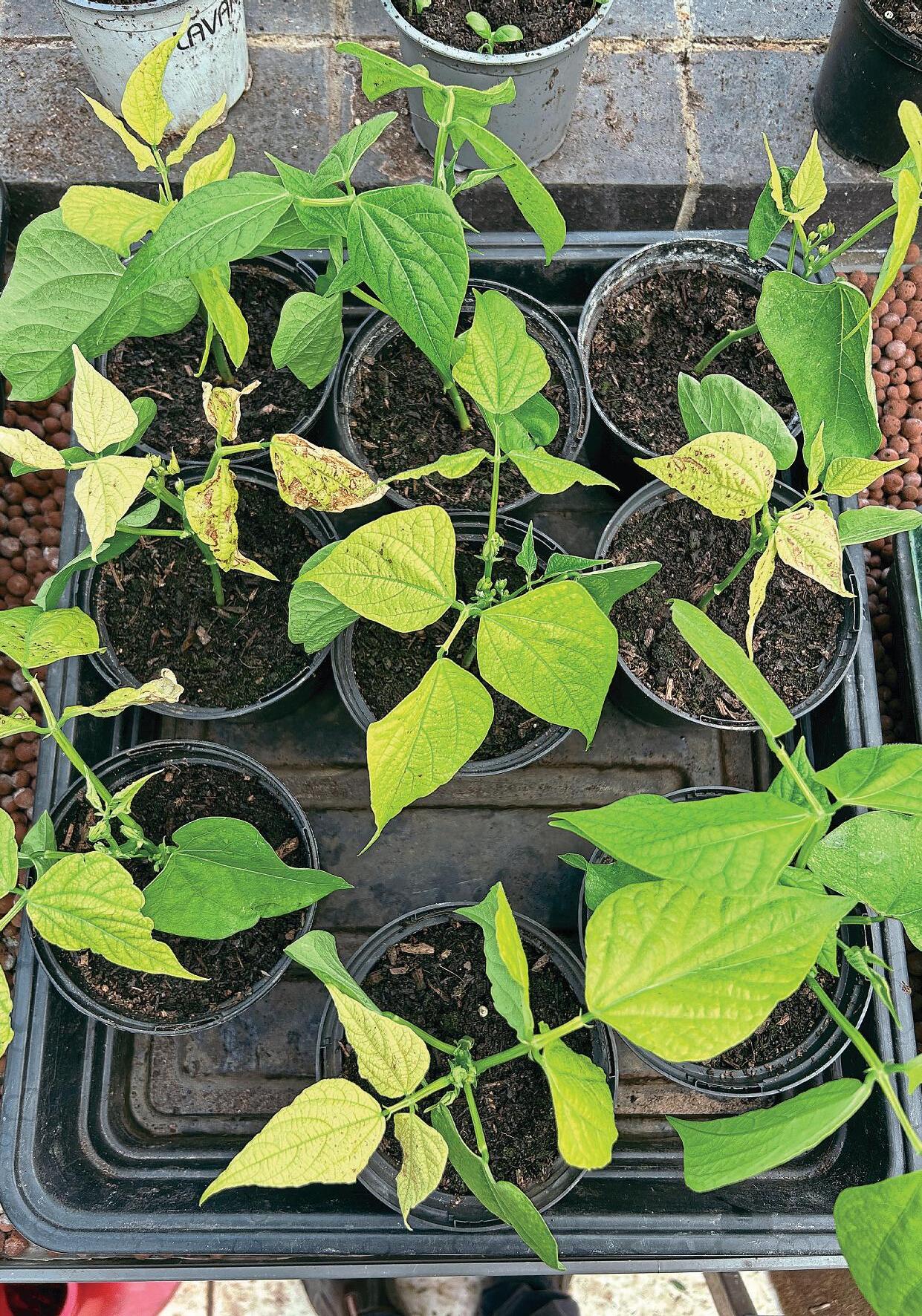 Inormally grow ‘Ferrari’ French beans with no problems, but this year for achange Idecided on ‘Boston’. I started these offin9cm pots in the greenhouse with alittle bottom heat beforetransferring to larger pots/ planting direct into the ground. The pots in the greenhousegive me an earlier crop beforethe ones outside become established. This year,growth was slow and many of the leaves turned yellow, with some turning upside down showing the leaf veins.