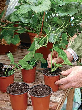 When the runners on theplants have developed, peg some down into small pots or trays of compost wheretheywill quickly root. Once rooted, cut the stems and youhave newplants for the following season. ■