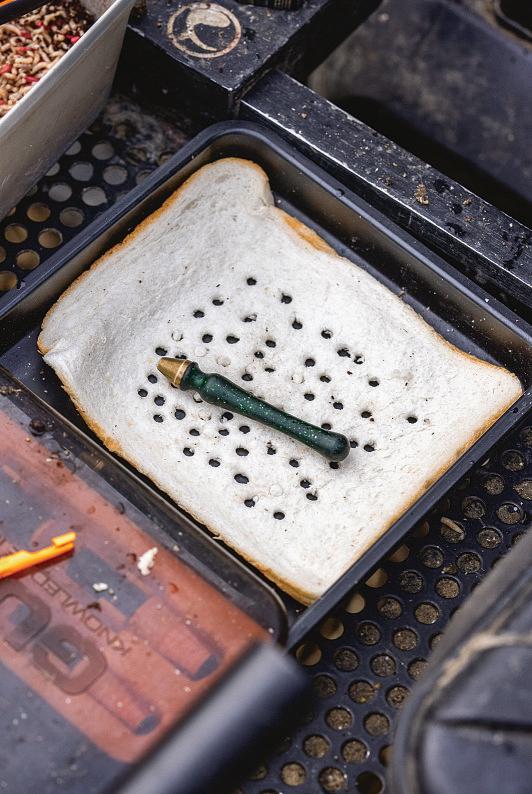 Go in gi no nt he brea d, I’ mu si ng a0 .6 gS pe ed Wi re fl oa t, sh ot te dw it ha bu lk of No 9s ho ta nd fo ur No 10 drop pe rs sp ac ed be lo w, al li nt he bo tt om 40 ce nt im et re so ft he ri g. Ih av ea 6i nh ook lin ko f 0.08m mP ureF lu oroc ar bo n to as iz e1 8S up er Fi ne Po le Sp ec ia lh ook ,0 .1 2m m Su pe rn at ur al Ma in lin e, a nd aN o3 Sl ip El as ti c. A 4m mp un ch is th eo pe ni ng pl oy,a nd pl ac in gt he ri g ri gh to nt op of wh eret he ba ll of brea dw en ti n, it ’s lik et he fl oa ti so ve rs ho tte d an dI ’m so on sw in gi ng in aroa ch ab ou t2 oz !T hi si s th ep ow er of brea d, fi sh co me st ra ig ht to it ,a nd in th ef ir st 10 drop si nI ca tc h as ma ny fi sh .T hi st el ls me th erea re al ot of fi sh in th ea re a, urgi ng me to ma ke su re If ee dt he lo ng er lin ep os it iv el y. Ev er yf ew mi nu te sI fi re in ha lf a po uc ho fh em pa nd th e sa me of sq ua tts ,h op in gt o pu ll as ma ny fi sh in to th e area as po ss ib le