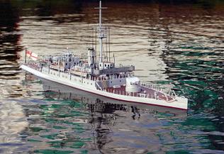 Royal Navy Units (URNU) as training vessels. The hull lines of these craft looked to me enough like an offshore power boat to work. Measuring 20.8 metres in overall length, with abeam of 5.8 metres and adisplacement of 54 tonnes, this would give ascaleof roughly 1:20 using my newlyacquired hull and would result in amodel displacement of around 6.75kg.