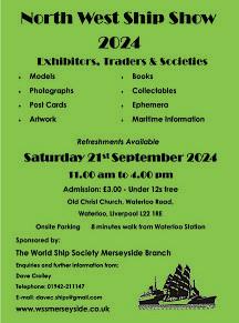From 11am to 4pm on Sunday, September 21, Old Christ Church in Waterloo Road, Liverpool L22 1RE, will play host to the North West Ship Show, sponsored by the Merseyside branch of the World Ship Society. Therewill be a wide array of maritimerelated models, collectables, books, photos, etc, to browse and buy.Entrance will be charged at £3 for adults, with accompanied children under the age of 12 admitted free of charge For further details, call Dave Crolley on 01942 211147 or email him at davec.ships@gmail.com