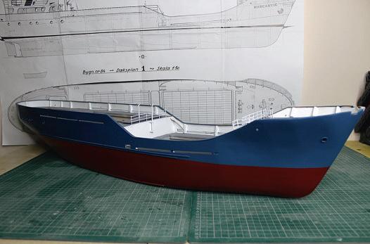 Regular readers will be awarethat this review had been flagged up for inclusion in an earlier issue,and we now come to thereason for the delay… Planning well ahead, I’d already bought some Mediterranean Blue spray paint in keeping with the Mercanida Shipping fleet’siconic schemetouse as themain colour for my hull. Unfortunately,however, despite applying this to atest piece first, after spraying thehull and leaving it out to dry Ireturned to find therehad beena nastyreaction between the paintand theprimer What’smore, sandingthe blistered paint back provedsurprisingly