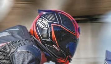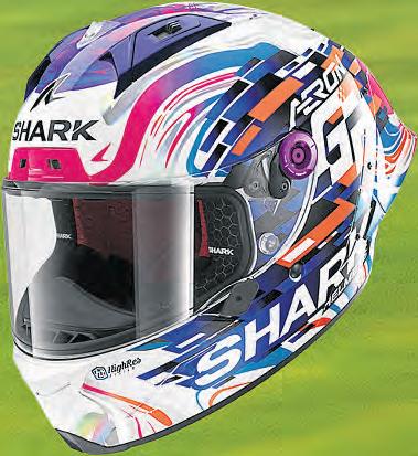 The first majoruse oftheGP was ontrack, over twodaysand14 sessions.That amountofriding, at afair pace,tells youall youneedto knowabout ahelmet –shortofwhat it’s likeina crash.Thecomfortwas pretty exceptional,andwhile Ican’t commentonwhether Icouldfeel ifthe Aeron’saerodynamicvirtues offered me amorepleasurable riding experience,whatIwould sayisthere wasnobuffeting to noteandthat my neck felt remarkably unstrainedafter so much ridinginshortsuccession. Ishouldalsopoint outthat the quietnessofthe Sharkwas notable, andanothergreattalkingpoint isthe ease withwhichyou canchangea visor.Ihateinstructions,andthanks to the simplicityofthefoolproof system,none were needed to change fromthe stockclear visor to the dark tintthatcomes with everyAeron purchased, withinits ownhelmet bag, alongside fivetear-offs…incaseyou want to make yourselffeel reallyfast. Long storyshort, it’s ahardhelmet to fault,and I’ve continuedenjoying wearingitonmanyroadridessince that trackdebut.Despitenot being much of aZarco fan, Iquitelikethe coloursofhis replica, too, though there’sa whole rangeofcoloursand carbondesigns to pickfrom. Formore info,headtothe Neviswebsite or, better still, popdowntoyourlocal dealerandtryoneonfor size.