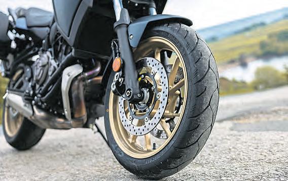 Thisissimplisticstuff,ofcourse.The890cc CP3triplemotor insidethe newR9isa fabulous powerplant,withstrong,torqueydelivery(and compliancewiththeEuro5rulesthatkilledtheold R6).Onthe roadit’sa verycapableunit,withallthe modernbellsandwhistlesthatcomewith ride-bywirethrottleand2024electronics.It’sbeentweaked fromtheversionintheMT-09,withdifferent fuel injectionsettingsandalteredfinaldriveratios–but thefundamentalsofthe890ccinline-threeDOHC 12vunit remainthesame,with aboreandstrokeof 78x62mmand11.5:1compressionratio.