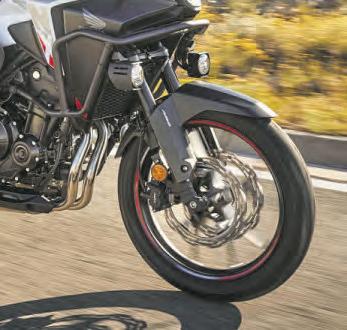 Theoptionalsemi-activesuspension comesfromJapanesefirmShowa, dubbed ShowaElectronicallyEquippedRide Adjustment(Showa-EERA).Specially developedforthe NT1100,theEERAclaims toautomaticallyprovideoptimum damping relativetostrokespeed,adjusting damping basedonbikespeed(fromtheECU), bike stanceandattitude(fromtheIMU),andfork behaviour(fromthestrokesensor).Anditall happensin15milliseconds.Thereare three pre-defined suspensionmodes: Urban, Tour andRain,plus acustomisableUsersetup that’sfullytweakable.