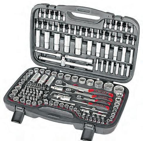 German firmLouisMoto hasitsownRothewald rangeofgarage kitand tools,including this 180-piecemetricsocket set.Itcomesin atough, hingedplasticcase, with 1/2in,3/8inand1/4indrive ratchetsandsocketsthat will covermostcommon bikejobs. Youalsoget T-bars,extensions, universaljoints,sparkplug socketsand arangeof Torx,femalestar,hexand screwdriverbits. Agood basefor afirsttoolkit,ora handyupgradeforoldrusty kit,we reckon.