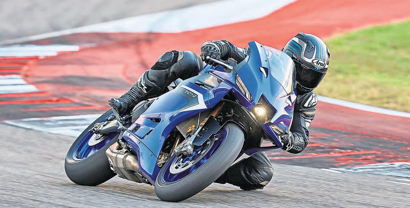 Lastbutnotleast,theR9ispackedwithup-todateelectronics,withlean-sensitivetraction,ABS (switchableonthe rear),anti-wheelie,slidecontrol, enginebrakecontrolandpowermodes.There’salso thelatestgenerationup/downquickshifter,cruise controlandBluetoothconnectivity,allaccessedvia afullcolour5-inchLCDdashboard.There’salsoan optional Y-Tracsetupaimedattrackusers,which addsfulldataloggingofallbikefunctionsincluding leanangleandtractionintervention,GPS,throttle position,gear,speedandengine revs,aswellas avirtualpitboard,thatletsyourpalsinpitlane message‘Get amoveon’every30 secondswhile you’retryingtowinintersagain.