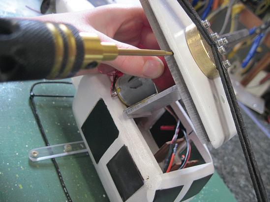 also givena propellorwith threeblades. Themotor and propellorweremounted at Nelly’s tail (photo6). Iglued themotor to asmall pieceof acrylic plasticthenscrewed it to theend of thetail. Ihad to do this twicesince thegluegot inside themotor thefirsttime andstoppedthe gearsfrom turning.