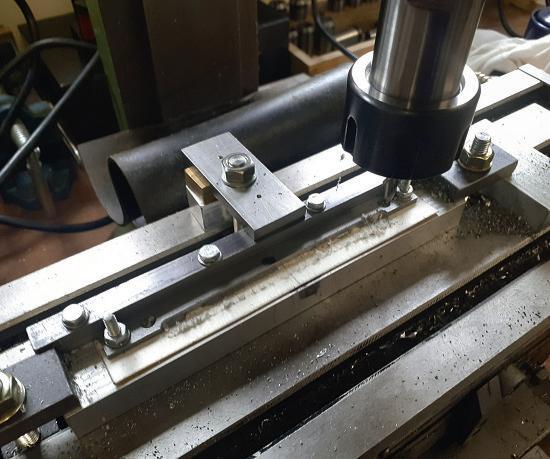 Photograph 13 demonstrates thebasic fixturing ideas. This wassimplya steel bar screwedtoa plybase, seton themill with alever TIand four sawn over length blanks forthe framesides clampedin place. Hold down holeswere then drilled. hoto ph 1 showsthe blanks bolted down andmilledtolength. The Starrett pattern edge finder is nowusedtoset up forthe co-ordinatedrillingofall four frames (secondlocomotiveas well).I tend to usewhatare catalogued as ‘ -type’ edge finders from Chronosasthey give amuchclearer indication of contact, making repeatability more consistent.I useone of theseand thestandardpattern Starrett edge finderveryoften forsetting up operations on themillingmachine.I canbe more accurate than usingthe ‘wiggler’typealthoughthey have theirplace,particularly forpicking up scribedlines and intersectionsofsame.