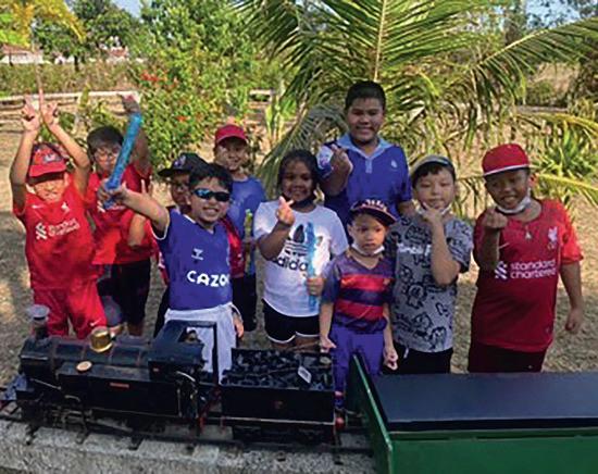 Thefirstrun wasattended by ourThaifamilywithgreat delight andwonderment at seeing theirfirststeam locomotive,albeita miniature, beingabletotakepassengers fora ride.The localchildren soon gottoknowabout thesetup andappeared regularlyon Sunday afternoons fora ride on thefarang’s(foreigner’s) train (photo29).