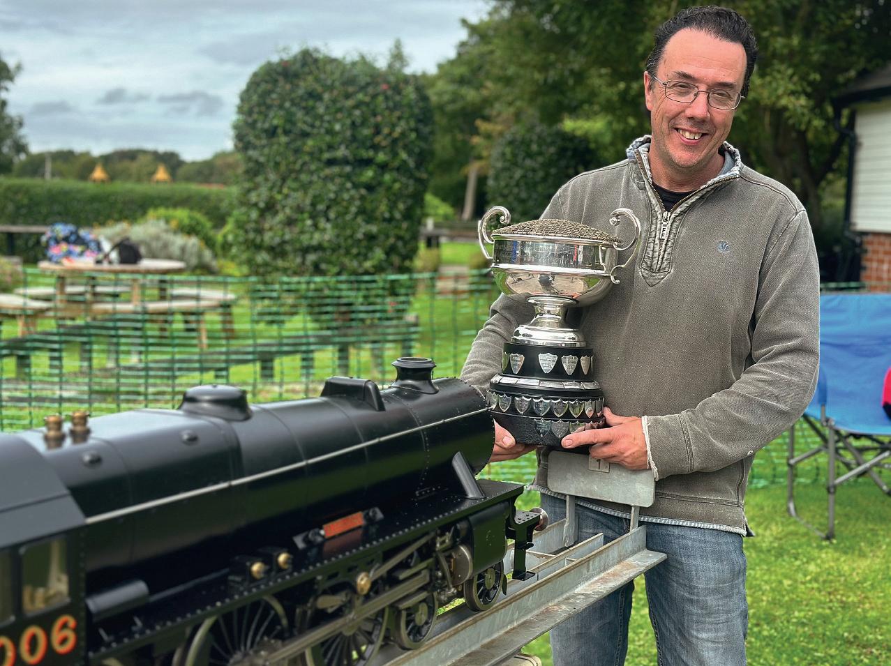 locomotive Russell,withan efficiencyof1.3%. Thirdplace wastaken by Lionel Flippance from Worthing,driving his BR proposed 2-8-2freight locomotive,withanefficiency of 2%.Billy StockfromUrmston came second,driving an LMS Duchess, with an impressive efficiencyof2.8%. This was toppedthoughbySteve Eaton from Chesterfield, drivinga Black5,withanefficiency of 3.1%.ThisisSteve’s fourth win at IMLECand ourfront cover showsSteve with therather grand‘Martin EvansChallenge Trophy’, named, of course, afterMartinEvans ‘MarkOne’, my namesake andillustrious former editor,halfa century ago, of ModelEngineer Full results, in theform of aspreadsheet,are availablefromthe IMLEC archive(www.imlecarchive com/imlecresults/2024) andwehopetoincudea comprehensiveaccountofthe competitioninour next issue.