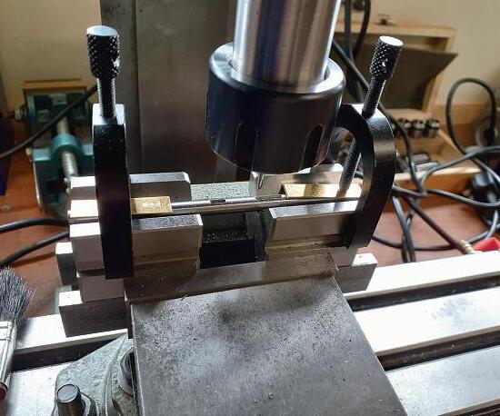 Couplingrodsare arelatively simple profiling ob on themill. Howeverthe crankpin holes arenot drilled, againonthe mill andthe profilingfixture, until thechassisand wheelsets are in place. Theresulting setupis then measured across theaxle ends so that thecouplingrod eyecentres canbeset.I was fortunatehereaswithnoplay each wasveryclosely matched. Profilingthe ends wasbasic with some filingbuttons after manually cutting away the excess lengthsfor holding on thefixture (photo21). The brassend bearings aremoreof afiddly ob to getright.Tubal Cain wascorrect in hiswritings that it is good practice to make more of thesefiddlybitsthan youneedwhilstyou areset up andthenuse thebestonesin assemblies.