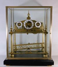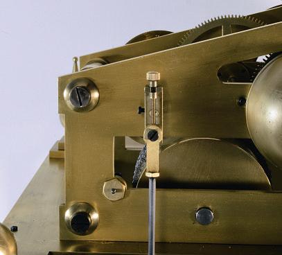 Pendulum clocks have to be leveland thependulum putinbeatinorder to operate correctly.The regularimpulse andswing of thependulum controls therelease of the escape wheel andwheel trainoveranaccurate and measured period of time.With aCongreveclock thesame principles apply, only here,the tiltingtable is theequivalent of thependulumwhich must tilt twicea minute in order to releasethe lockingwheel, letting thewheel trainoperate andthe handsmoveforward Unlikea conventional clock, thewheel trainofa Congreve clockisnot constantly driving theescapementand hands; only when thetable tiltsand thelocking wheel is released does themovementwheel train advanceand drivethe three handstogetheratthirtysecond intervals.