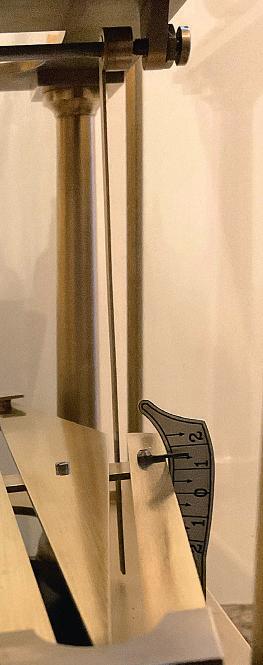 Once thetable is leveland theballisrunning correctly, increasing or decreasing the angleofthe tableisthe only variable meansofadjusting thespeed of theballand the timekeepingofthe clock. Initially,the crankadjustment screwshouldbeadjustedso thelow topcornerofthe tilted tableisroughly oneand a quarterinchfromthe surface of thebottomplate as seen in photo12.The ball canthenbe setinmotiononthe tableand arecordofthe timekeeping made.Ifthe clockislosing time,the angleshouldbe increasedtomakethe table tilt at agreater angleand increase thespeed of theball; conversely theangle should be decreasedifthe ball is running toofastand theclock gaining in time.The crankadjustment screwonlyrequiresa small amount of regulation to make a noticeable difference to thetilt of thetable andthe speed of theball.