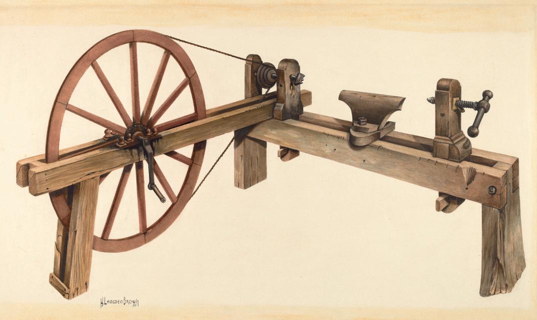 Painting of aManual Woodturning Latheby H. LangdenBrown,1939.