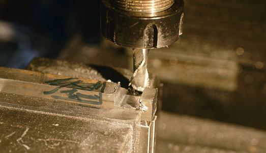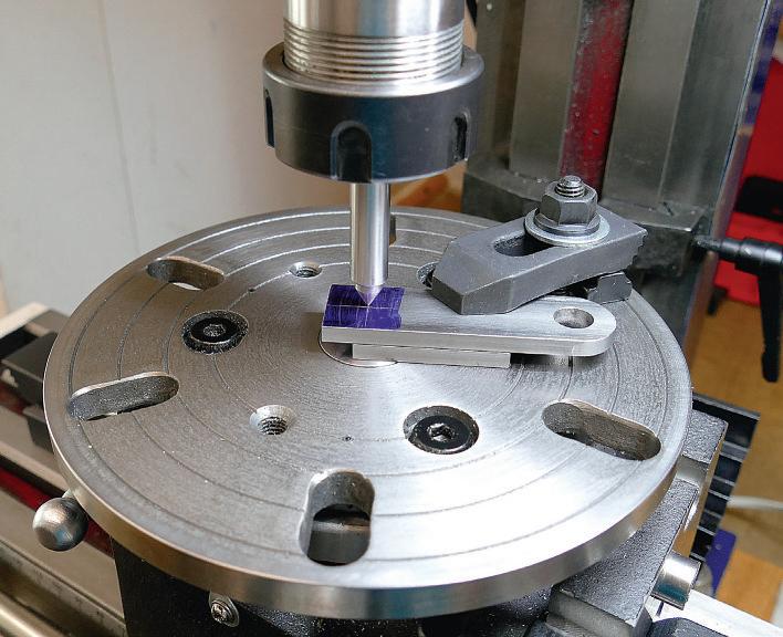 Photograph 7 shows aworkpiece with a mm diameter hole ftted into the insert and the endmill forming the end radius. In photo 8 the fnished radius and, minus the swarf, the insert can be seen.