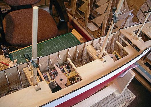 The masts stepped and located by their thwarts and the false decks being cut and ftted. On the sail arm just above the battery are the braces for the main mast yards; these run up through the deck via fairleads either side of the mizzen mast and are temporarily tied to the mast about 200mm above the deck.