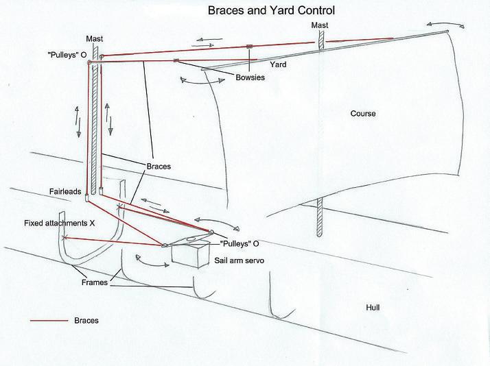The layout of one pair of braces for one sail on one mast. On the model there are two pairs per square-rigged mast: one pair for the course (the lowest square sail) and one for the fourth square sail from the deck, to space out the pull on the masts.