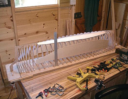 With the lines plan on the wall behind, here the frst frames for Nev’shull going onto the buildingboard.