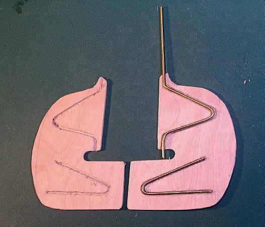 The rudder,part built, with the brass wire to be sandwiched between the halves obvious.