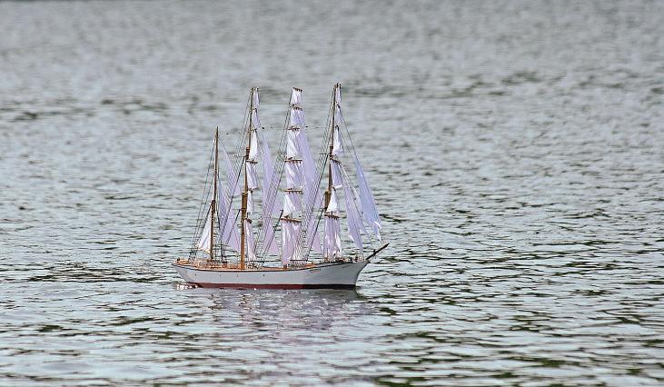 The open aspect of the large lakes of North Tyneside on whichIsail offer the perfect conditions for my large squarerigger models, and this one is aparticular beauty! Ibuilt her from plans drawnup by Harold Underhill to ascale of approximately 1:68, and she measures in at amighty 1360 mm long (from stern rail to bowsprit end), with abeam of 190 mm and amain mast height,fromkeel to maintruck, of 775 mm.