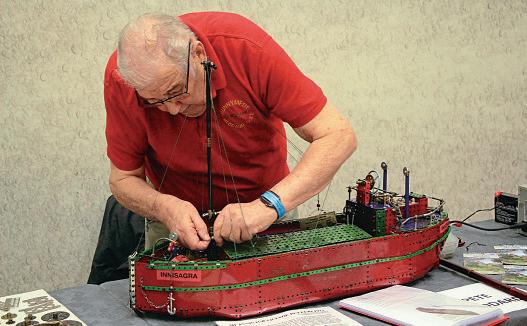 Peter Goddard of the Runnymede Meccano Guild and his model of the1912 Clyde Puffer Innisagra. Clyde Puffers were small vessels used on the canals around Glasgow and powered by early oil engines, hence no funnel.