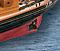 The next step was the rudder. Sailing ship rudders weremanually operated, with no power assistance, so they weretiny in relationtothe size of ship. Ascale rudder wouldbe ineffective in thetight confines of a model boat pond, so mine was built at least ten timesscale size. Ibuilt it in two halves, sandwiching between them piecesof2.5mm diameter bent brass wireincut grooves, such that the wireprotrudedfromthe top and bottom to fit into the underside of the stern and into aremovable bracket made from bent brass sheet at the bottom end of the hull.The wirewas bentwithin the ‘sandwich’ so that twisting thetop by use of an operatingarm wouldmake the rudder turn from side to side. The whole assembly was then glued and clamped until set. Abrass tube was set into the stern to accept the top wireofthe rudder, whilethe bracket mentioned above was fitted to the stern to accept the bottom wire.The rudder could then be fitted, with an operating arm attachedtothe top wirewithin thestern and the arm connected to the rudder servo in the usual way