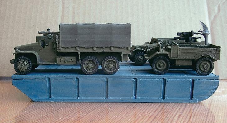 Mike’sinitial model, with 6in gaps between pontoons, just fitted on the build plate of his 3D printer in one piece. Online he managed to find free print filedownloads for many useful World WarIIarmy trucks, etc, so many,infact, he’d need aRhino ferry to carry them all!
