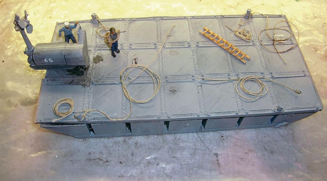 Mike’smodel pontoon lighter for landing aircraft from aferrying aircraft carrier to aPacificisland, built to 1:72 scale, so about 7in long.