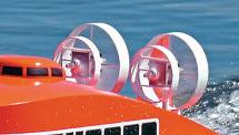 Another striking featureofthese pontoons was adeck-mounted motor unit. This came complete with Z-drive to power a3ft Øpropeller. The propeller,onthe end of along stem, was protected by three strong horns ahead of it. The propeller and its vertical stem could be steered and also hinged out of the water to store upright for beaching, etc.Infront of the motor was abuilt-in fuel tank and beside it acontrol panel with steering wheel, the whole unitbeing portable and mountedonI-beam skids which bolted to thestandardholes in the raft angle irons.