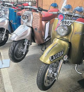As always, the BSA Bantam Owners Club put on afine displaywith everything from racers to pigeon carriers! TwomoreDouglas Vespas with an ‘on point’ leopardskin print sparewheel cover