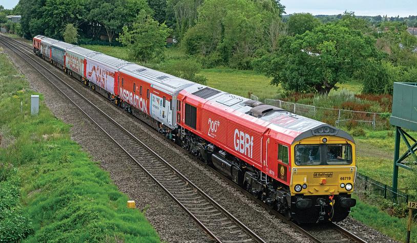 Repainted to match the Belmond’s BritannicExplorer, GB Railfreight’s No.66748 approaches BasingstokeonJuly3, takingthe newluxury train from Eastleigh(Arlington) to London Euston fora preview. Thelocohas also been named St Michael’s Mount.GBRfhas said that from 2027, Class 99s will be usedonthis train. SPENCER CONQUEST