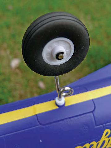 However, if youdodecide to fit the undercarriagepermanentlythen youwill find it’s an easytask,starting by dropping thenose legintoitsholenearthe nose, not forgetting to addtheplasticthrust washer. Theend of theleg protrudesintotheRx LiPobay ashort distance from the factoryfittedsteering servowhereit islockedinplace withtherearofapair of welldesigned steering arms,thefrontone of which isalready screwedtothe servo.The twoarms engage to providethenosewheel steering.