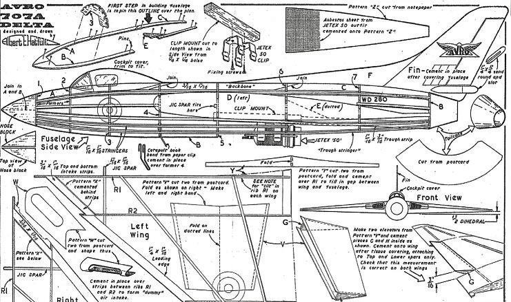 Abrowse online foundthe planthat I remembered so fondly. Theoriginalmodel has aspanof13.5” andthe 50 mm fanfromthe Hawk would easilyftinatwice-sizeversion Andwith much more wing area it would surely flyslowlyenough formyold headtofollowwouldn’t it Avro 0 planwas easy to findonline. Thesheet partsare included andare remarkably accurate,evenwhen enlarged.
