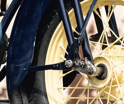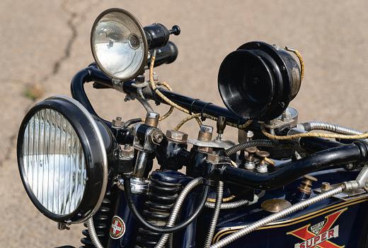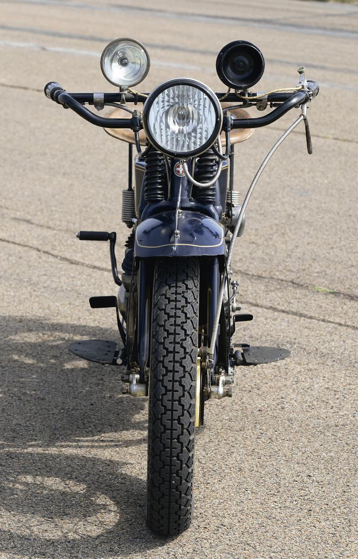 Considering this rear brake wasasked to slowthe Super Xonits ownwhenthe bike wasnew in 1925, with the option of an internal expanding brake within the rear hub and operated by your rightheel,maybe the frontdrum which laterreplaced that, as on this DutchPolice bike,was asmar tchoice. Just could have been bigger, that’sall