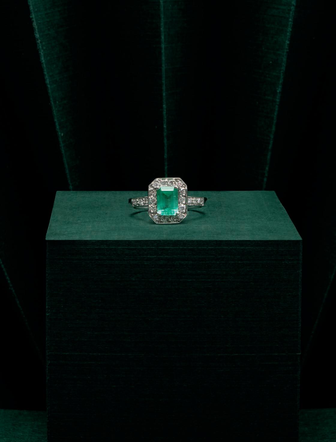 7• ANILLO CON ESMERALDA Y DIAMANTES EN ORO BLANCO DE 14K