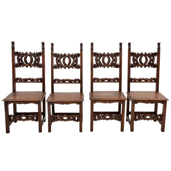 Respaldo semiabierto con personajes, asiento cerrado, fustes torneados, chambrana en "H" y soportes tipo carrete