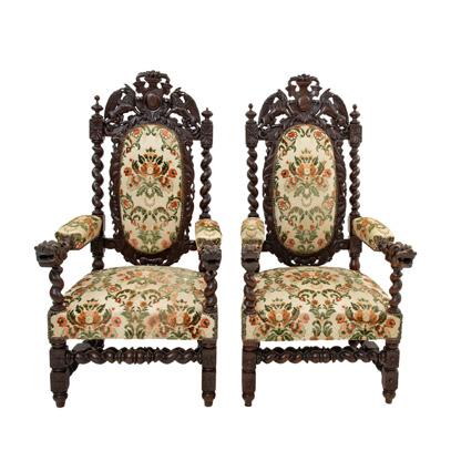 Cuentan con respaldo semiabierto con talla de escena campestre, asiento acojinado, tapicería textil aterciopelada color azul, chambrana en "H", fustes torneados y soportes tipo carrete