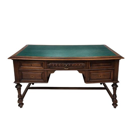 Cuentan con respaldo y asiento acojinado, tapicería textil color verde, remaches de metal dorado, chambrana en "H", fustes torneados y soportes tipo carrete