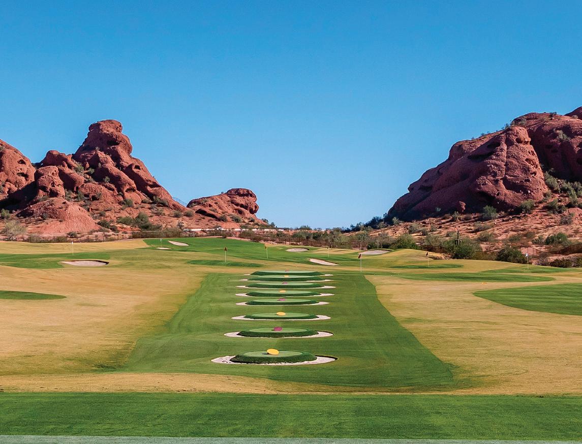 At Papago Golf Course outside Phoenix, Arizona State’s 22,000-squarefoot practice facility features 21 target greens, including a series of eight cascading targets ranging from 30 to 145 yards, with bells in the middle that ring on perfect strikes, though around the chipping greens, head coach Matt Thurmond relies on just a piece of chalk to outline the delineation between success and failure.