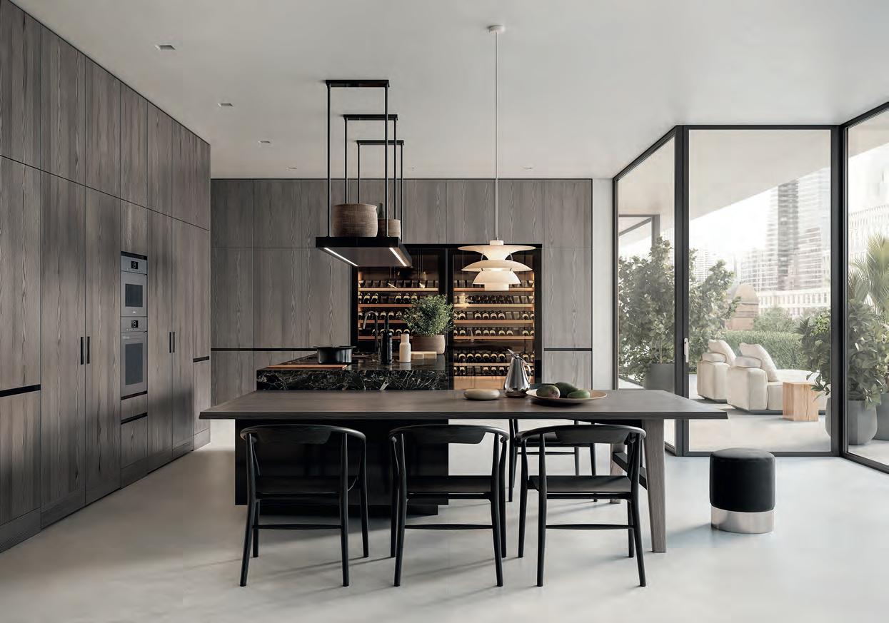 angles and celebrates the combined dimension of living. Alessandro La Spada’s secret wall, Duncan, is a true architectural treasure. On one occasion, it reveals the presence of a kitchen inside, making this space unique yet functional. The wall transforms, revealingbehind the sophisticated wooden surface - the new Eidos walk-in closet by Fabio Bonfà, created with a lightweight structure in metal and ribbed glass. Bonfà’s second design is the new upholstered Boid – characterized by a linear wooden structure outlining the perimeters of the upholstered volumes.