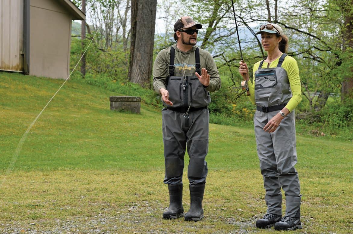 Dustin schools the author in how to cast and fight the trout she hopes to catch.