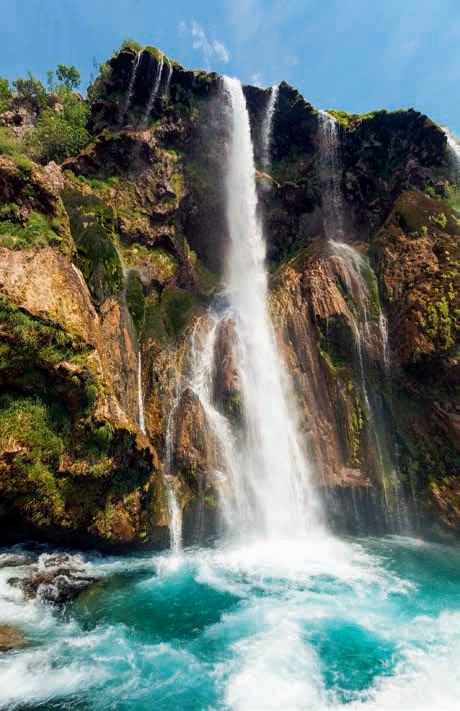 The Krčić River carves its way through a rocky canyon at the foot of Mount Dinara, ending its course in Knin with a mighty waterfall, where the Krka River is born.