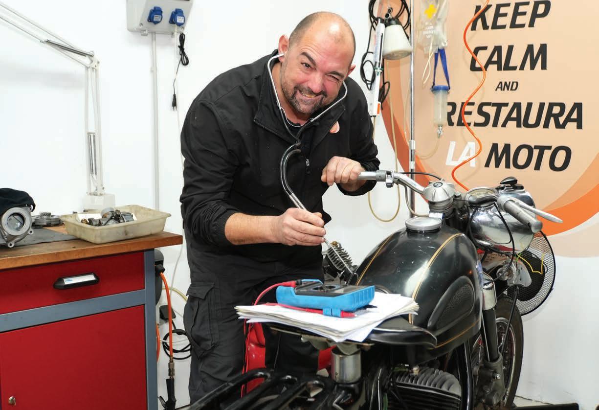 Restaurar motos le apasiona y es impresionante al nivel de detalle al que es capaz de trabajar. Seguidor de la Carta Turín (ver recuadro), analiza absolutamente todas las piezas de la moto y, según su estado, actúa en consecuencia. En sus trabajos realiza entre 800 y 1.000 fotografías del proceso de restauración para que el cliente sepa todo, absolutamente todo, lo que ha realizado sobre la moto.